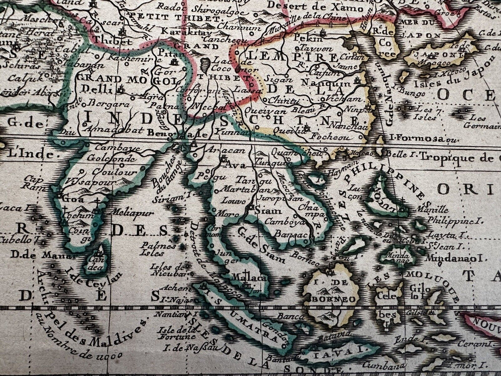 Interesting projection which includes a named source of the Nile river in Africa across to an undefined partial outline assigned to the Land of Jesso above Japan. Tibet is named, as is the grand mogul in India. An engraved note along Russia’s eastern most coastline across from modern day Alaska is labeled as being little known.