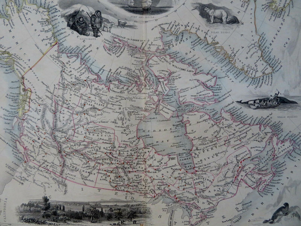 (Old Maps, 19th Century Maps, Decorative Maps, North America, Canada, Polar Bears, Esquimaux, Montreal, Whaling, Seals).